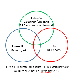 Viime keväänä kerroin teille alle kouluikäisille lapsille annetuista suosituksista liikunnan, ruutuajan ja unen suhteen (Kuvio 1). Jäimme silloin pohtimaan, miten suomalaislapset täyttävät nuo suositukset ja lupasin selvitellä asiaa. Olen elänyt hyvin mielenkiintoisia kuukausia etsiessäni teille vastauksia ja pohtiessani kaikkea löytämääni.